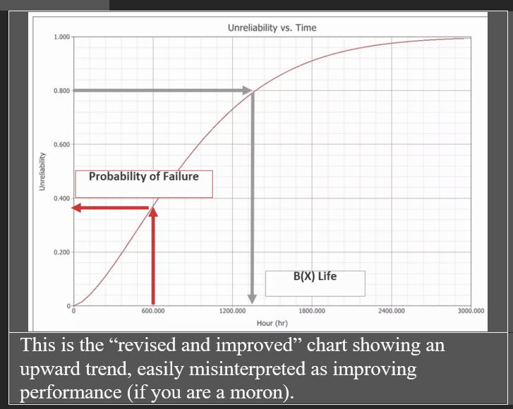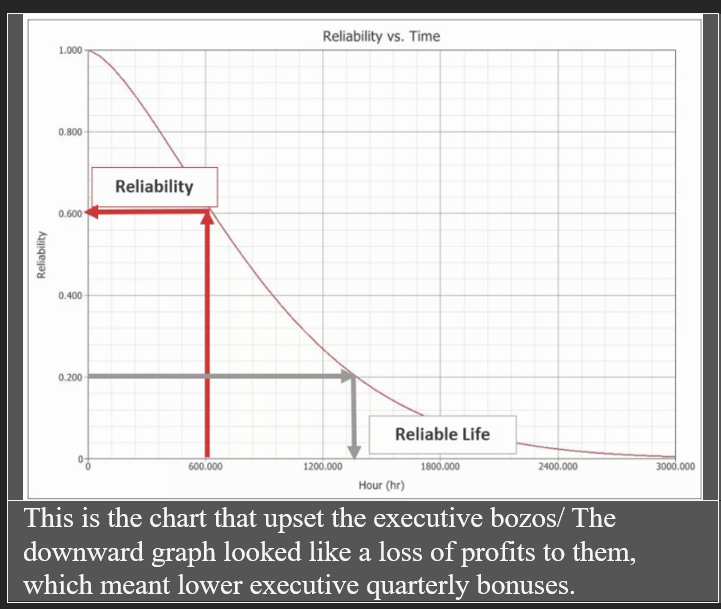 I honestly have to say that is one of the fuckin’ dumbest things I have ever heard from anyone pretending to be an adult. By that time, I’d put in 30 years in corporate America and I was pretty used to hearing astoundingly stupid things from executives. Still, that one pushed the boundaries pretty hard. So, the next week after I’d acquired a little more failure data and a lot more understanding of the failure mechanism, I provided the graph (above) in my presentation. The execs were “happy” with the graph, but obviously it didn’t accomplish anything because the last generation of Ventak ICDs weren’t recalled until 2005 (unwillingly, as a result of an FDA investigation and a Cleveland Clinic cardiologist who produced his own database) for two more generations of equally flawed medical devices.