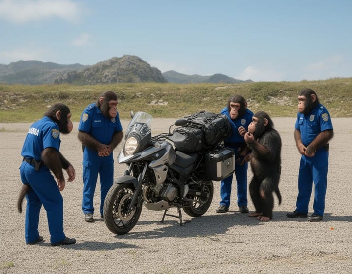 For a guy who made a significant bit of income as a writer, mostly for magazines, I was not much of a photographer until I bought my first decent smart phone a few years ago. The digital camera I’d brought on the trip was locked in the tail case and I didn’t think to ask if I could retrieve it before being sequestered in the office. However, an AI art program did a pretty serviceable job of re-creating the scene on the inspection slab and this AI-generated picture is how I have described the Border Control “inspection” for the past almost-20-years. Five uniformed “officers” wandered around the bike for a LONG TIME without managing to open any of the storage, other than the zippered tank bag. Being the macho boys they were/are, none of them thought to ask me to show them how to get any of my luggage open. They just wandered aimlessly around the bike, just like this picture, until they gave up and handed me my keys and told me “get outta here.”