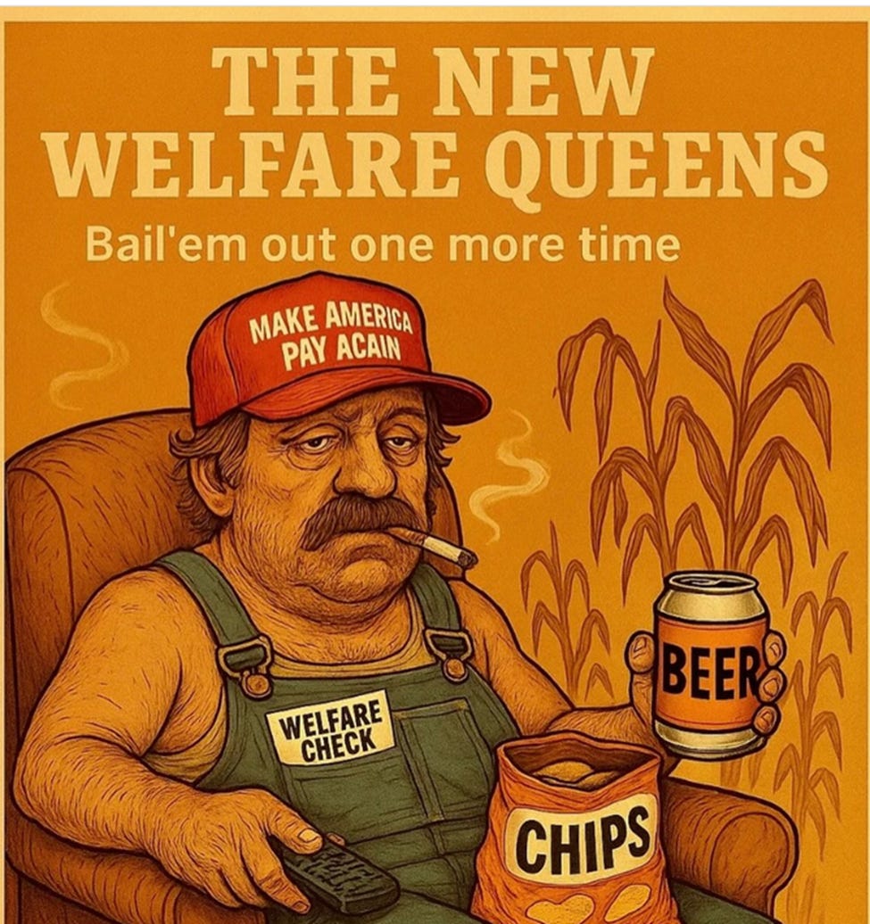 Keep that in mind the next time you hear a politician babbling about “income distribution.” 99% of livestock in the United States is factory-farmed and U.S. farming is rapidly becoming a corporate venture, with the “family farm” designation becoming more of a farce every year. The USDA Economic Research Service (ERS) defines a family farm as “any farm organized as a sole proprietorship, partnership, or family corporation. Family farms exclude farms organized as nonfamily corporations or cooperatives, as well as farms with hired managers.” Under this definition, a multi-million-dollar corporation, managed by cousins who own slightly more than 50% of the corporation, is a “family farm.” The term masks the shift toward industrial-scale agriculture, where large-scale family farms (which can be thousands of acres) account for a significant portion of production. Those corporate “farmers” are who bawls the loudest when their “way of life” is threatened by economic and societal changes and any reduction in their corporate welfare checks.