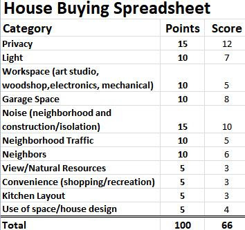 One evening, I started to list the things I expected a home to have if I were going to be happy in it. After I finished my list, I showed it to her and she added a few things to the list. That was a little helpful, but not really a decision-making process. So, I put some numbers (points) on the list we'd made. We discussed/argued those items and points for a good while until we had a decision list with which to score a house. After that, we'd visit a house and immediately afterwards argue out how we thought the house scored on our spreadsheet. If a house didn't break 75%, it went into a trash file and we didn't discuss it again. Over 75% and we would start the process of deciding how much we would be wiling to pay for it. Unfortunately, for me, that original spreadsheet lived on a Samsung tablet that I managed to lose in the Chicago train station 5 years ago. So, I "reinvented" the spreadsheet (right and above) just to give you and idea what might have been on our decision list. Many of the items on this list were on the list that we used to find our home, but the points and descriptions are my best estimates. As you can see, the mythical house I was scoring on this example came up short with 66 points (66% positive) and it wouldn't have been given any more consideration.